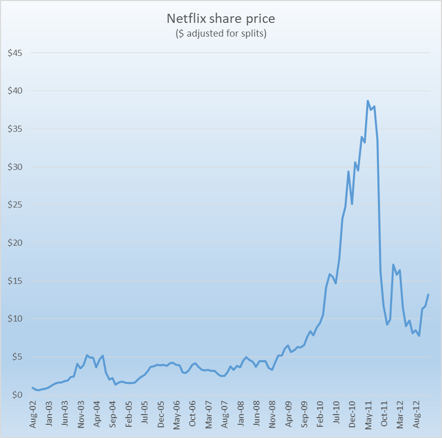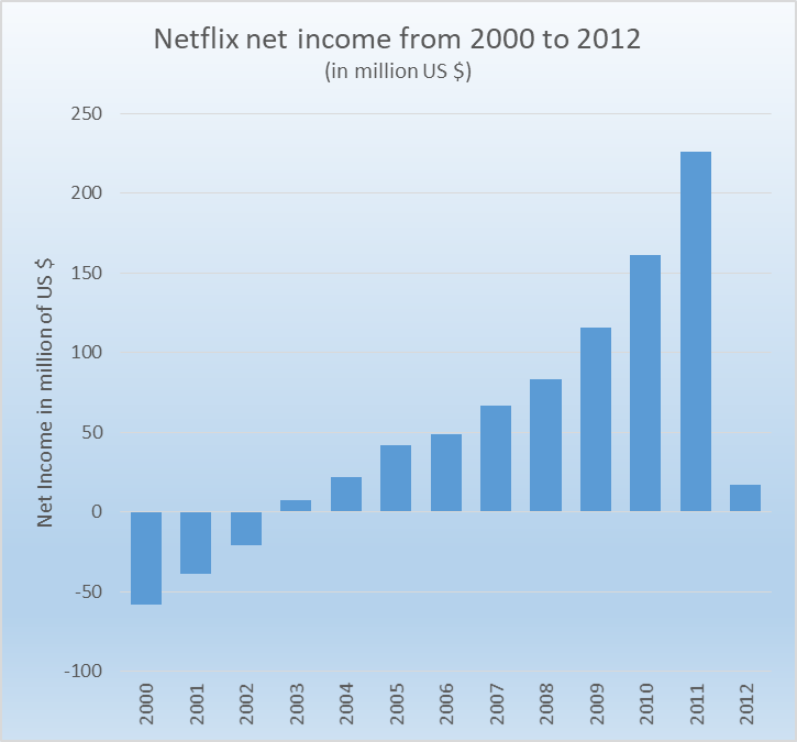 In Netflix’s case, they went from $200+ million of net income in 2011 to less than $20 million in 2012.